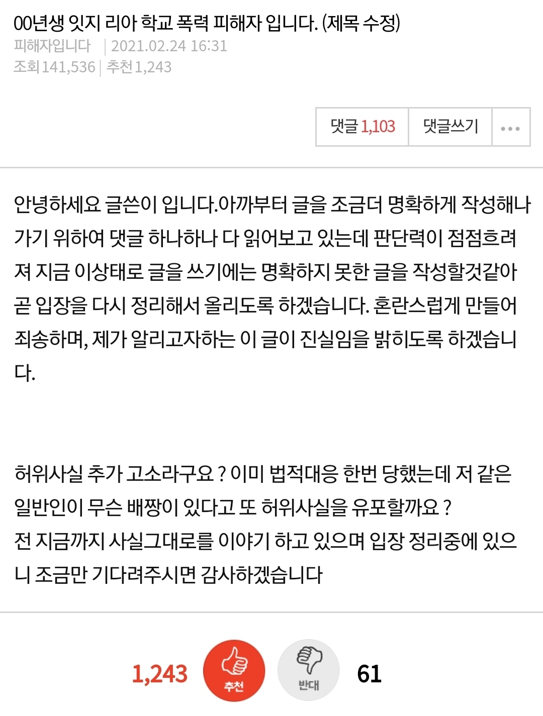 걸그룹 '있지(itzy)'의 멤버 리아(21)로부터 학교폭력 피해를 봤다고 주장했다가 명예훼손 혐의로 고소당한 동창생이 경찰 수사에서 무혐의 처분을 받았다. 당시 리아 소속사 jyp엔터테인먼트 측은 '허위사실'이라고 선을 긋고, 공식 입장문을 통해 본 건은 지난해 당사가 글쓴이를 허위사실 유포에 의한 명예훼손혐의로 고소해 현재 조사가 진행중인 사안이다. 경찰은 a 씨와 리아 측 모두를 불러 조사했다면서, a씨가 허위사실이 아닌 자신의 경험을 근거해 글을 썼다고 밝혔습니다. Itzy 소속사 jyp엔터테인먼트 측은 13일 스포츠투데이에 보도를. 있었던 학폭(학교 폭력)이 없어질 순 없다.